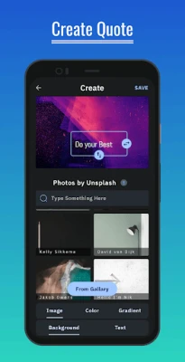 Categories are conveniently grouped for easy access. Tap on the quote widget to instantly change the displayed quote. Personalize any quote by tapping to change its gradient, color, or background image. Unleash your creativity with our quote designer or maker and save your masterpieces to your gallery.