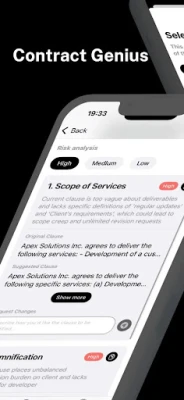 Choose between Free Mode, which includes contract analysis with ads, or upgrade to Premium Mode for $9.99/month to unlock unlimited scans, no ads, and priority processing. Contract Genius empowers you to understand legal documents faster, uncover hidden risks, and confidently rewrite risky clauses.