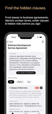 Get clear, concise summaries of key contract clauses and plain-language explanations of legal terms.