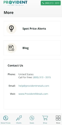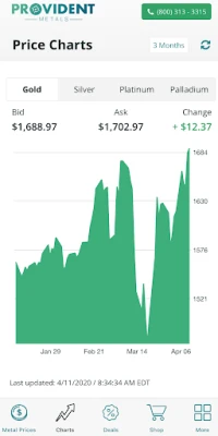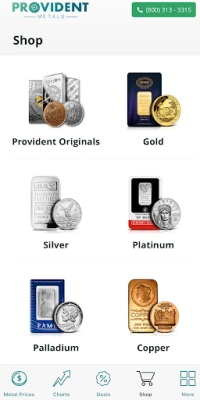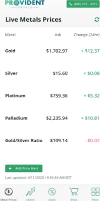 The Provident Metals Android app offers up to the minute gold, silver, platinum, and palladium prices. Stay in tune with markets using our interactive precious metals charts, and set custom spot price alerts to receive text and/or email messages when the gold price or silver price hits your target level. Browse the Provident Metals specials tab, offering our best deals on gold and silver bullion shipped directly to your door.