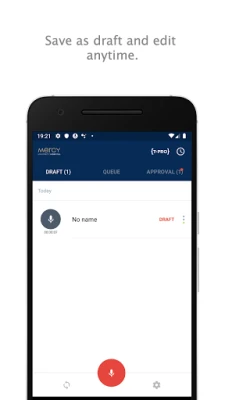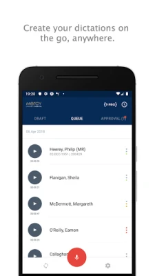 The Mercy Dictate app allows users to create dictations on the go, and securely send them the the Mercy platform for processing. Uploaded dictations can be tracked as they are processed by transcription teams or Mercy's back-end speech recognition servers.