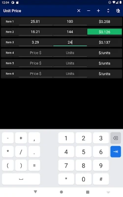This app is fast because it's dead simple: just type two numbers and you're done. To use the app, just enter the price of the item and the number of units (oz, lbs, number in package, etc). It will calculate the unit price and highlight the best price as soon as the numbers are entered. There are fields for the quantity, name of each item and the name of each item's units, but they're optional.