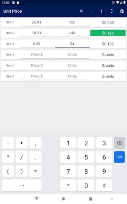 This simple app allows you to compute and compare the price per unit of up to six items. It can be useful at any store - is it worth it to buy the bulk package? Which size saves you more?